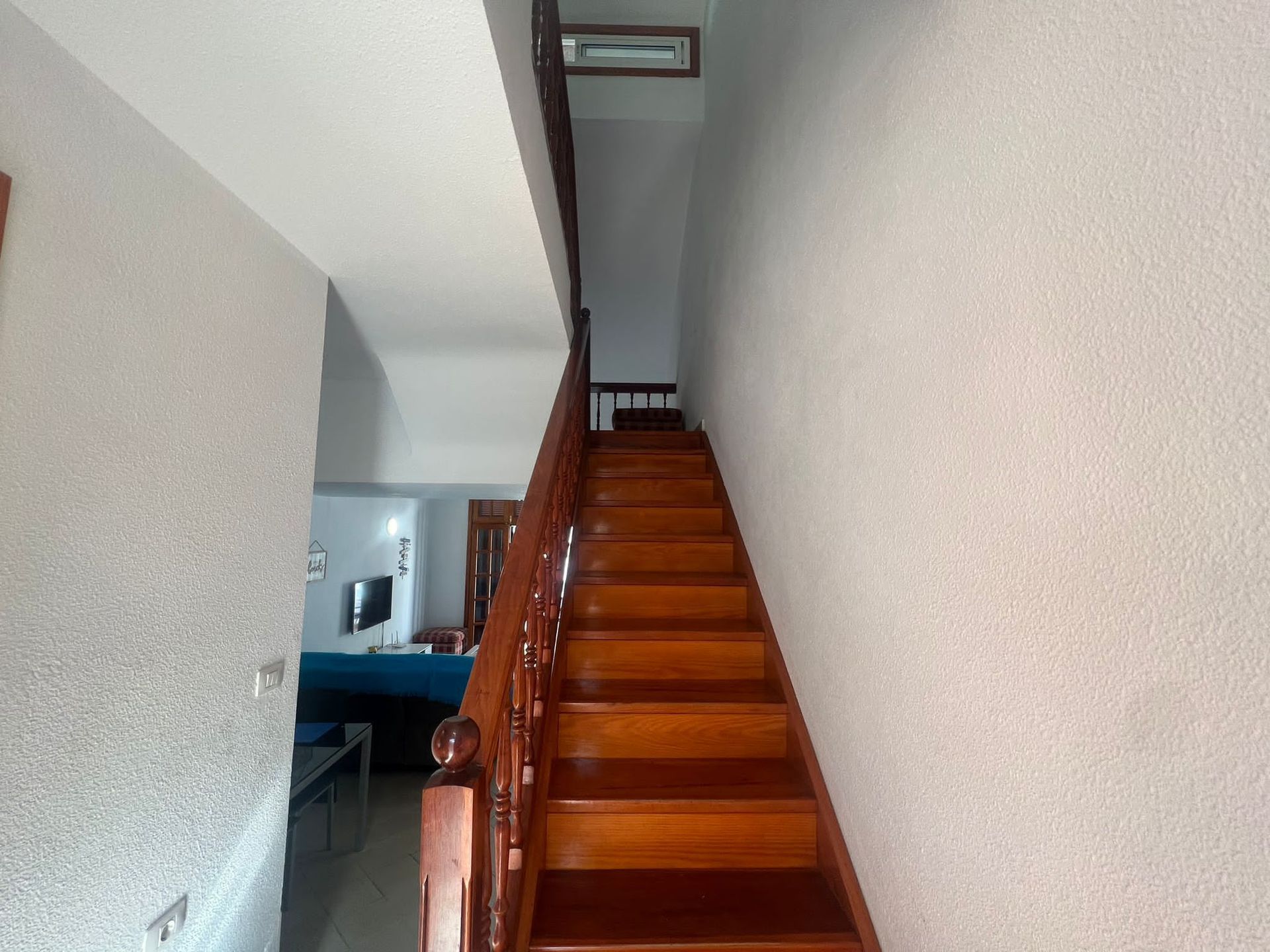 The stairs to the upstairs are dark wood, and again extremely well looked after. A nice secure, save banister and the corner is wide enough to maneuver round. Reaching the top, you will find the mezzanine area, which could be space for a sofa bed for an extra guest or made into an office. Or simply a nice quiet area with a chaise lounge to relax and read.