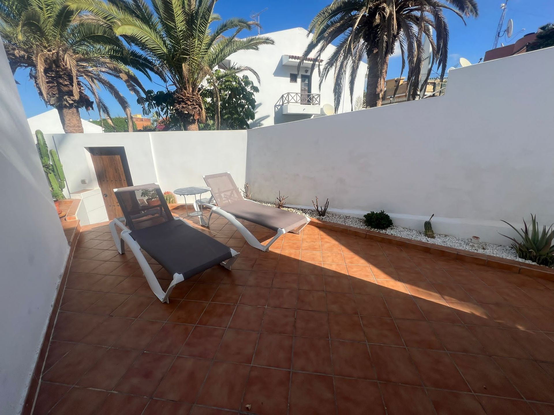 This 2 bedrooms/2-bathroom corner house situated on a plot of 114 sqm has its own door onto a walkway leading to La Pinta beach in only 5 minutes. You can walk along the front to Los Cristianos (a busier town with shops, bars and restaurants. And a busy harbour where you can watch the ferries at the main port) or you can walk in the opposite direction as far as La Caleta. (a small fishing village, which popular restaurants on the sea front)